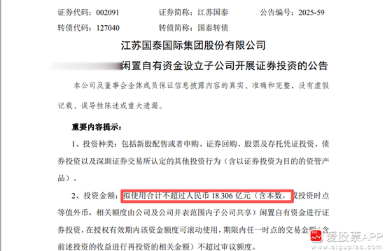 目前,江苏国泰及其下属公司已投入3.306亿元资金进行证券投资。同时,江苏国泰子公司江苏国泰紫金科技发展有限公司,拟以自有资金15亿元投资设立子公司张家港市鼎瑞投资有限公司(暂定名)开展证券投资业务。江苏国泰公告称,在充分保障公司日常经营现金需要的前提下,公司以闲置自有资金适度开展证券投资,可以提高资金使用效率,丰富闲置自有资金的投资方式。近年来,江苏国泰的证券投资收益不甚理想。2023年、2024年及2025年上半年,江苏国泰证券投资计入权益的累计公允价值变动分别为-6045.51万元、-6927.04万元及-7195.60万元。(中国基金报)