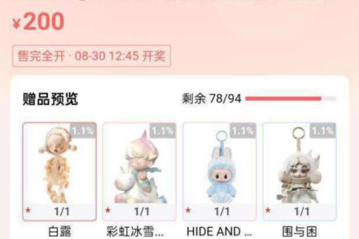 千岛福袋以“盲盒类抽赏”形式进行,每张商品卡对应一个赠品,100%有赠品,用户购卡后随机获得赠品。至于相关赠品的价值,既有上千元的限量款潮玩、卡牌等,也有远低于福袋售价的普通品。其实,广大用户参与的初衷,不过是为了花很少的钱,靠运气获得价值不菲的赠品。但现实情况却是,他们在刺激引导之下,往往迷失在大量购买商品卡、循环往复消费之中,“小成本”非但没有“大回报”,反而是“赔了夫人又折兵”。
