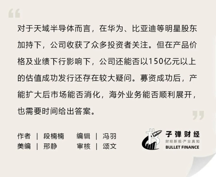 对于天域半导体而言,在华为、比亚迪等明星股东加持下,公司收获了众多投资者关注。但在产品价格及业绩下行影响下,公司还能否以150亿元以上的估值成功发行还存在较大疑问。募资成功后,产能扩大后市场能否消化,海外业务能否顺利展开,也需要时间给出答案。